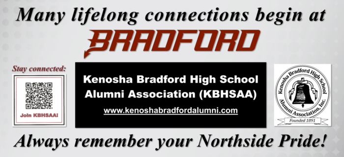 Welcome to the OFFICIAL Kenosha Bradford High School Alumni Association, Inc. (KBHSAA) website! We encourage all alumni to join KBHSAA, an IRS-recognized 501(c)(3) organization. You'll find the Membership & Donation Form here. This is the Alumni Association's only endorsed, official website.